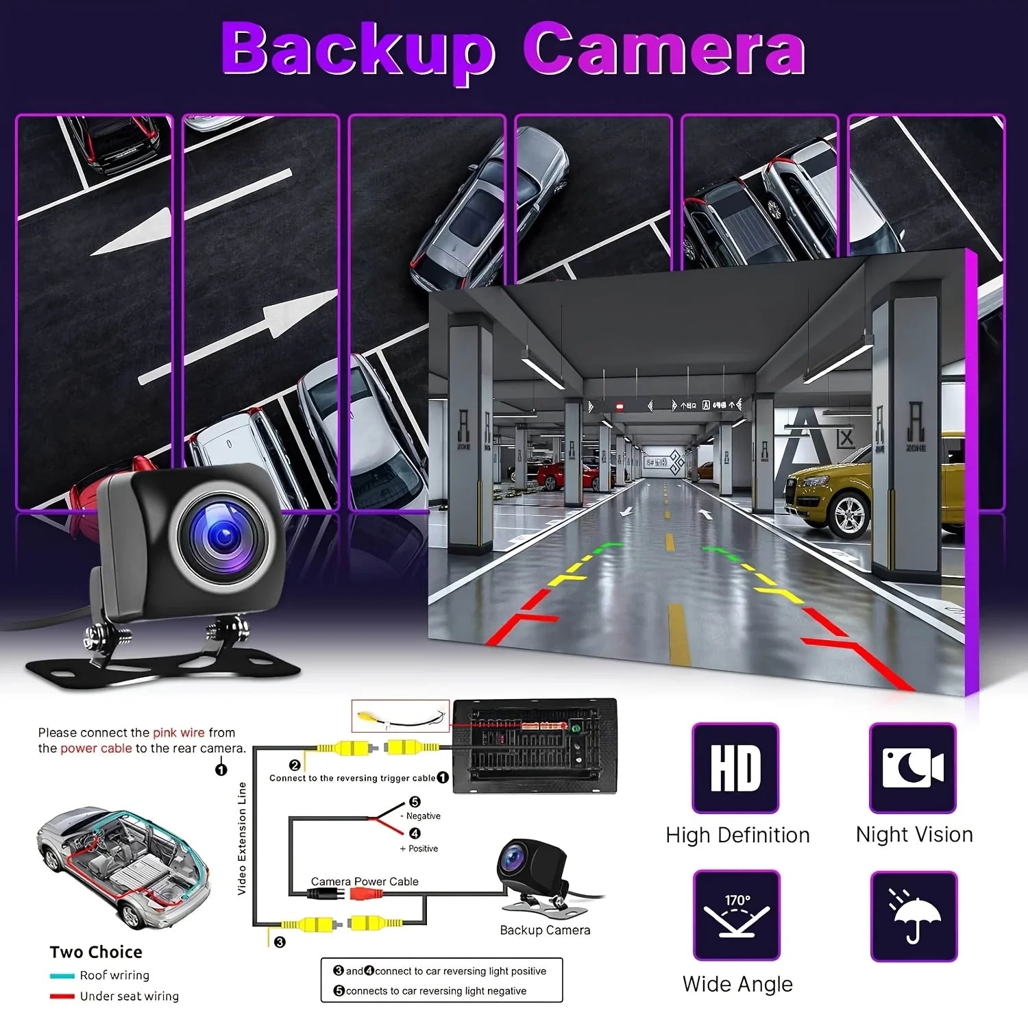 ● The HD night vision rear view camera has a 170 ° ultra wide viewing angle design, which can help you park safer and easier at night or in rainy weather. When the vehicle is in reverse gear, you will see the rear environment on the large screen. Convenient wiring and simple installation.
