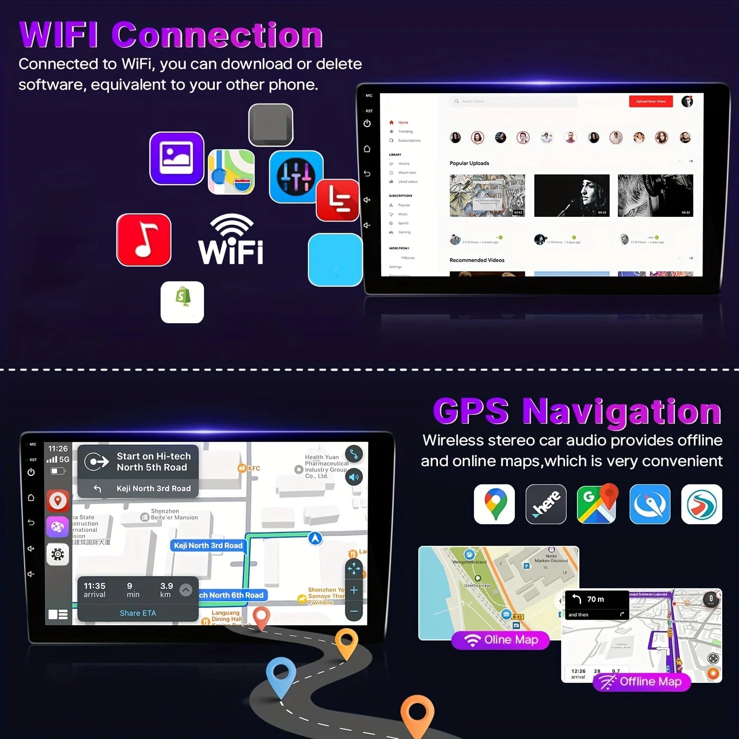 ● Supports Online Maps & Offline Maps——After connecting the car audio to WiFi/hotspot, you can access the online map, which is compatible with most navigation applications in the app store, At the same time, you can also download the map and use the car audio navigation even without a network.