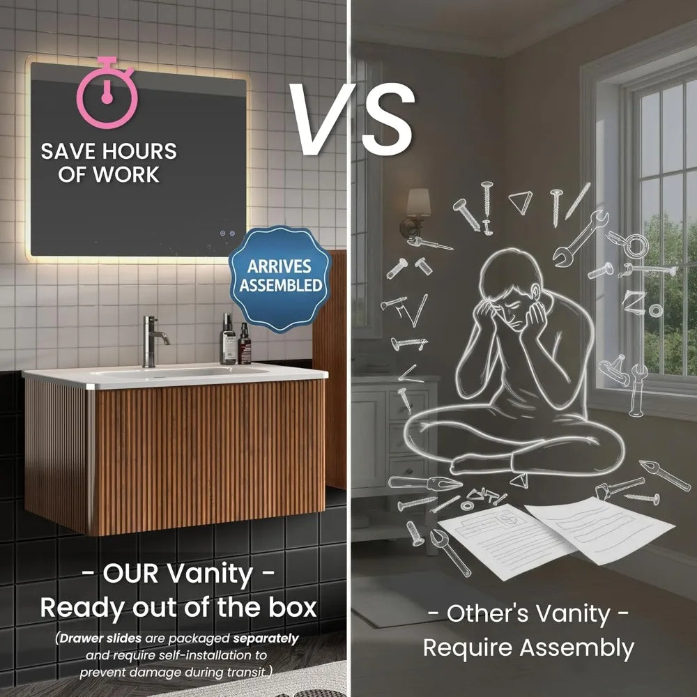 - 【CURVED EDGES FOR SAFETY】Your safety is our top priority. Our vanity with drawer is crafted with elegantly curved edges. The modern look is not only for aesthetic appeal but also with your family's safety in mind. Say goodbye to sharp corners and welcome a sense of security into your home.