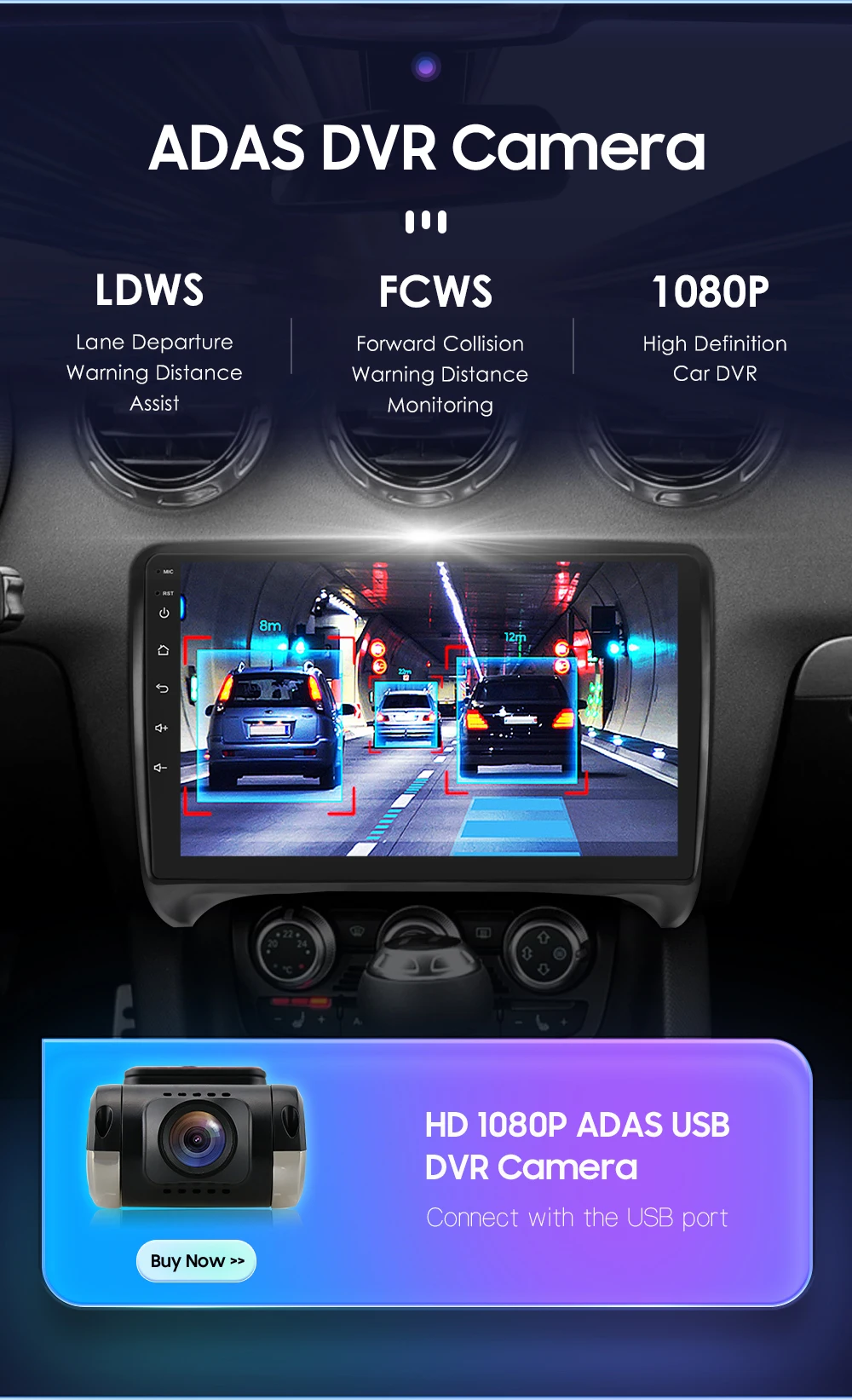 HD 1080P ADAS DVR Camera(Needs to order separately) --connect with the USB port: LDWS(Lane Departure Warning Distance),FCWS(Forward Collision Warning Distance), 1080P(High Definition Car DVR).