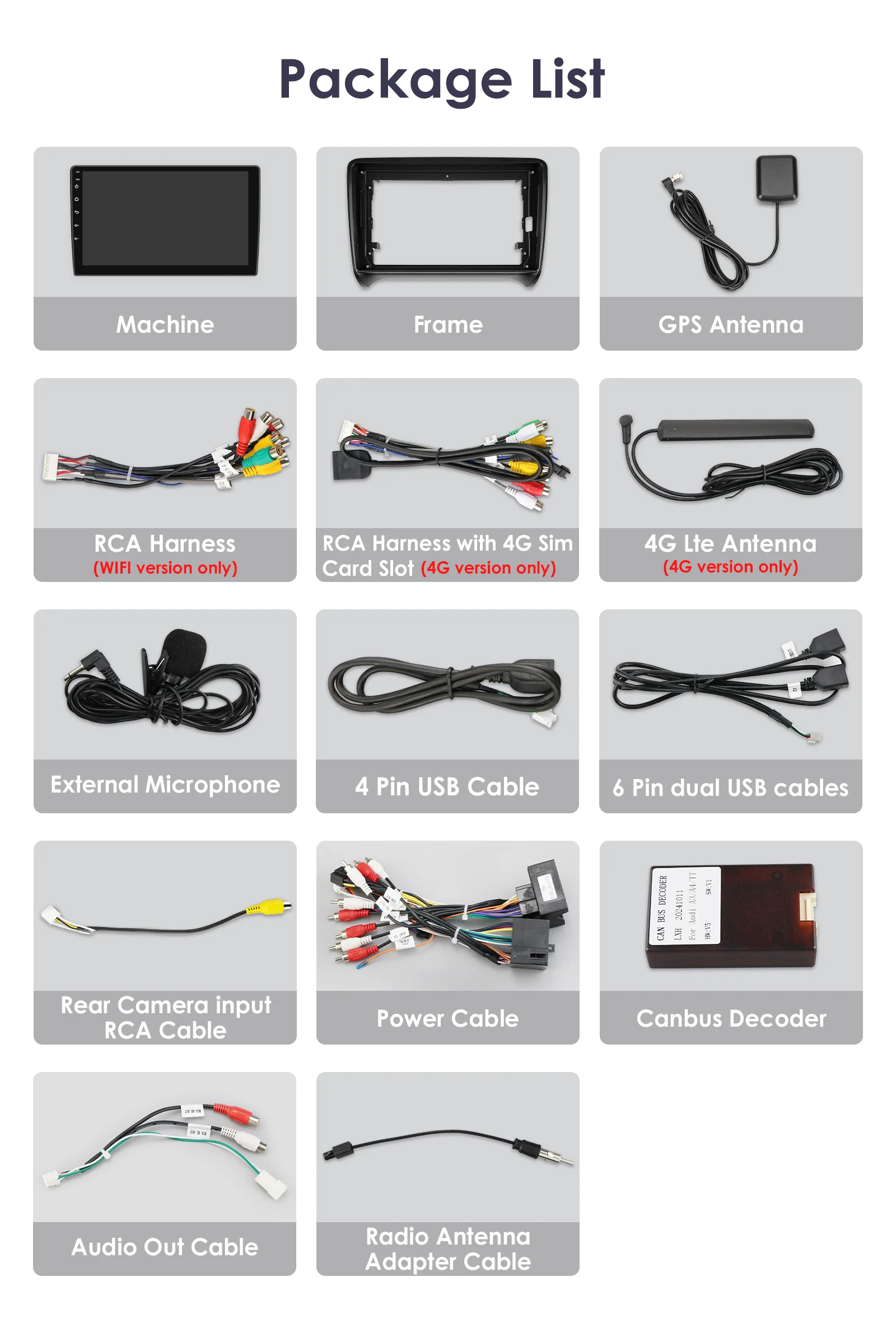 Standard Accessories: which ship with the head unit together(but please pay attension to the red words of accessory whether can get or not which depends on the item option you choose to buy it)