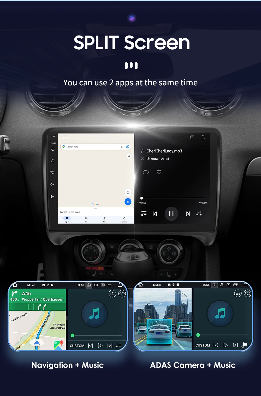 Split Screen : You can use 2 apps at the same time (such as: Navigation + Music , ADAS Camera + Music ,etc.)