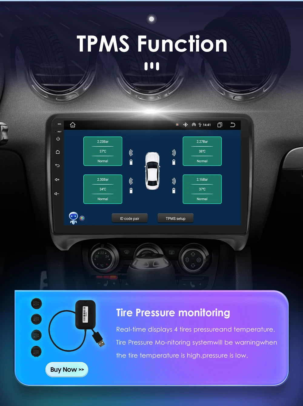TPMS Function( Needs to order separately) : Tire Pressure Monitoring: Real-time displays 4 tires pressure and temperature,Tire Pressure Monitoring system will be warning when the tire temperature is high, pressure is low.