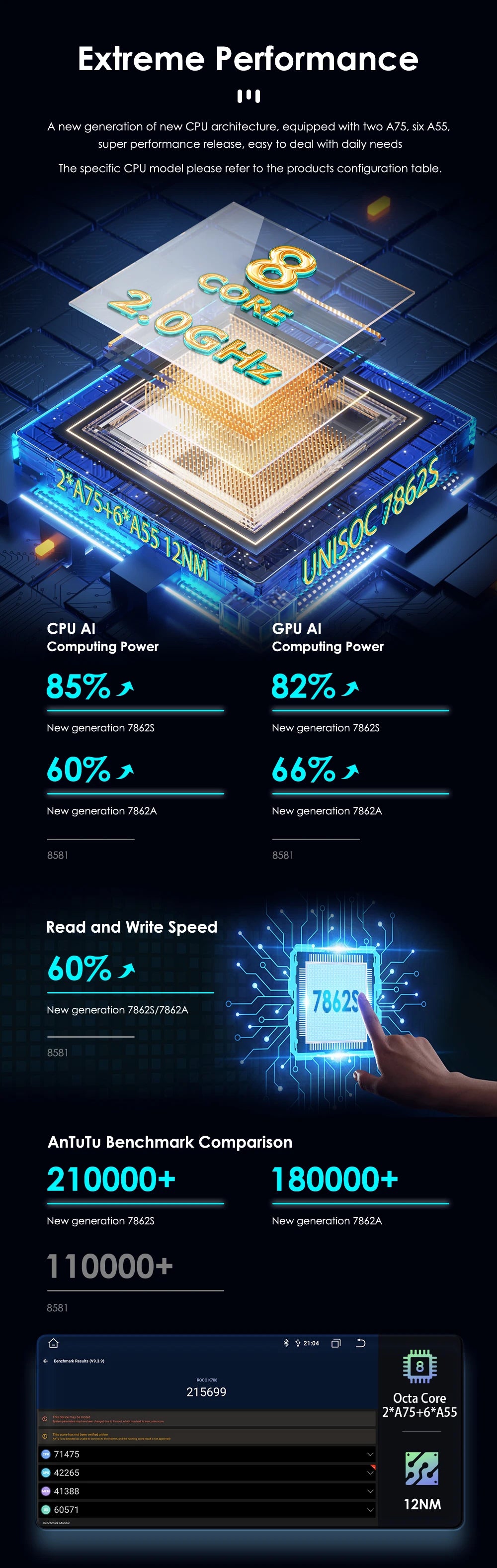 Extreme Performance: A new generation of new CPU architecture, equipped with Two A75,six A55,super performance release ,easy to deal with daily needs. The specific CPU model please refer to the products configuration table.
