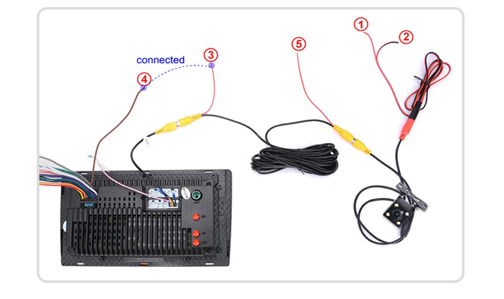3)The reversing detection cable @ Brown color is connected to the red cable @ which extending from the video input cable