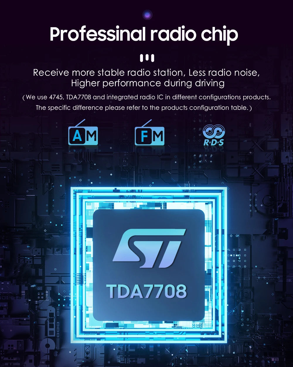 Professional radio chip: Receive more stable radio station ,less radio noise, higher performance during driving. (We use 4745,TDA7708 and integrated radio IC in different configurations products, the specific different please refer to the products configuration table.)