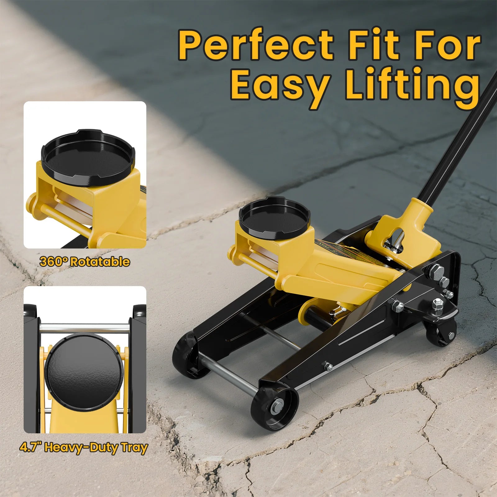 Crafted with a combination of heavy-duty steel and lightweight aluminum, this jack is both durable and portable. Its 4 wheels (2 universal rear casters) and side carrying handles make it easy to move and position in your garage or driveway. A rubber saddle and foam handle sleeve protect your vehicle during use, while the 360° rotatable saddle ensures precise placement.